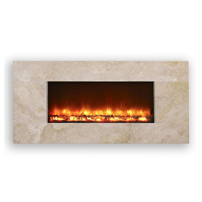 The Travertine 1100 model adds a sophisticated, stone-inspired finish to the wall, making it a natural focal point in living rooms, lounges, and open-plan spaces. Its smoky, layered flame effect offers a calming ambience that replicates the depth and movement of a real fire — without the need for wood, fuel, or a chimney.