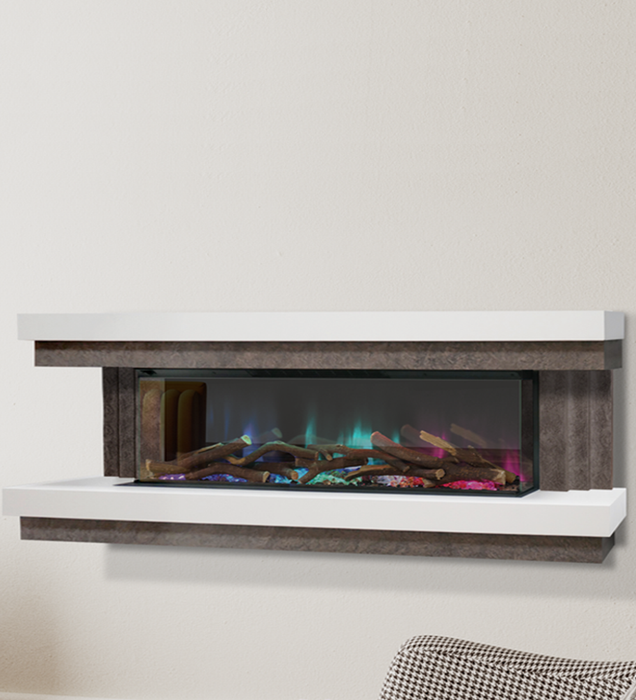 Choose from four elegant finishes—Essence, White, Sienna, or Soapstone—each complemented by stylish side wings in Soapstone or Sienna. Select either Silver Birch or Woodland log effect to complete the look of your fuel bed. For added atmosphere, the optional e-illuminate mood lighting kit casts a soft ambient glow around the fireplace suite.